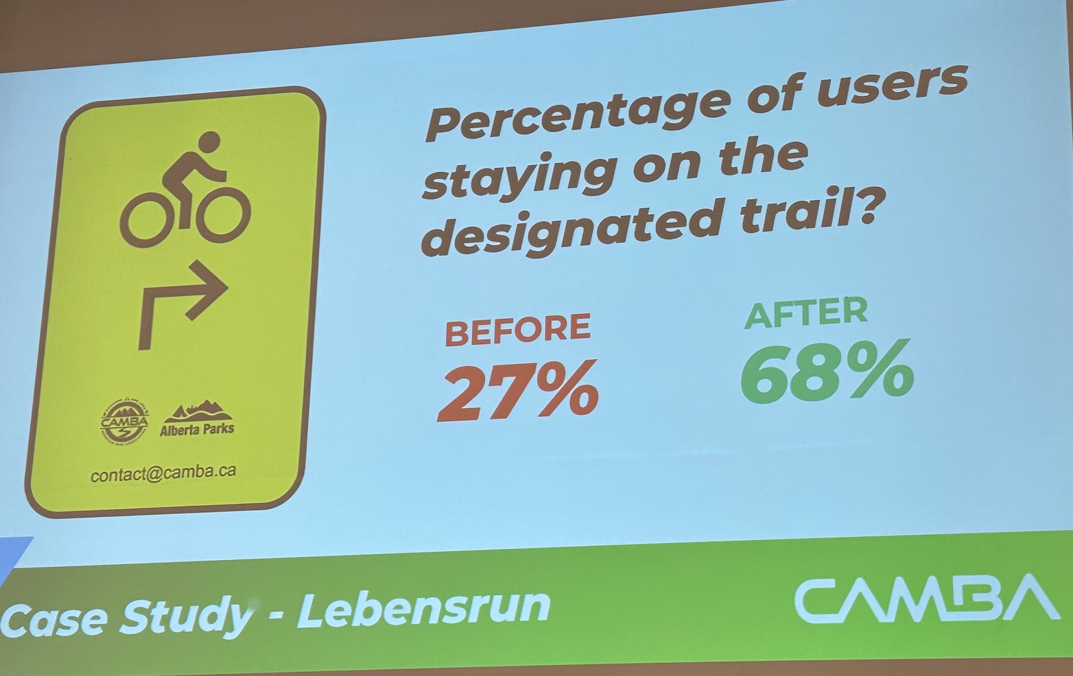 Deoliveira pointed to the immediate changes in user behaviour that could be gained simply by improving wayfinding and signage. After showing some images of existing trail signage, he presented a picture of a redesigned sign CAMBA placed on a local trail called Leben’s Run. The data showed that only 27% of users stayed on the designated path before the new sign versus 68% of users who stayed on trail with the new sign.